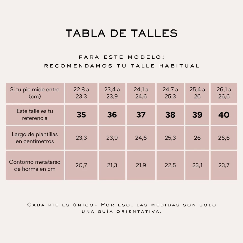 Recomendamos elegir tu talle habitual. Si estás entre dos talles, optá por uno más para un calce óptimo, especialmente gracias a su plantilla acolchada.